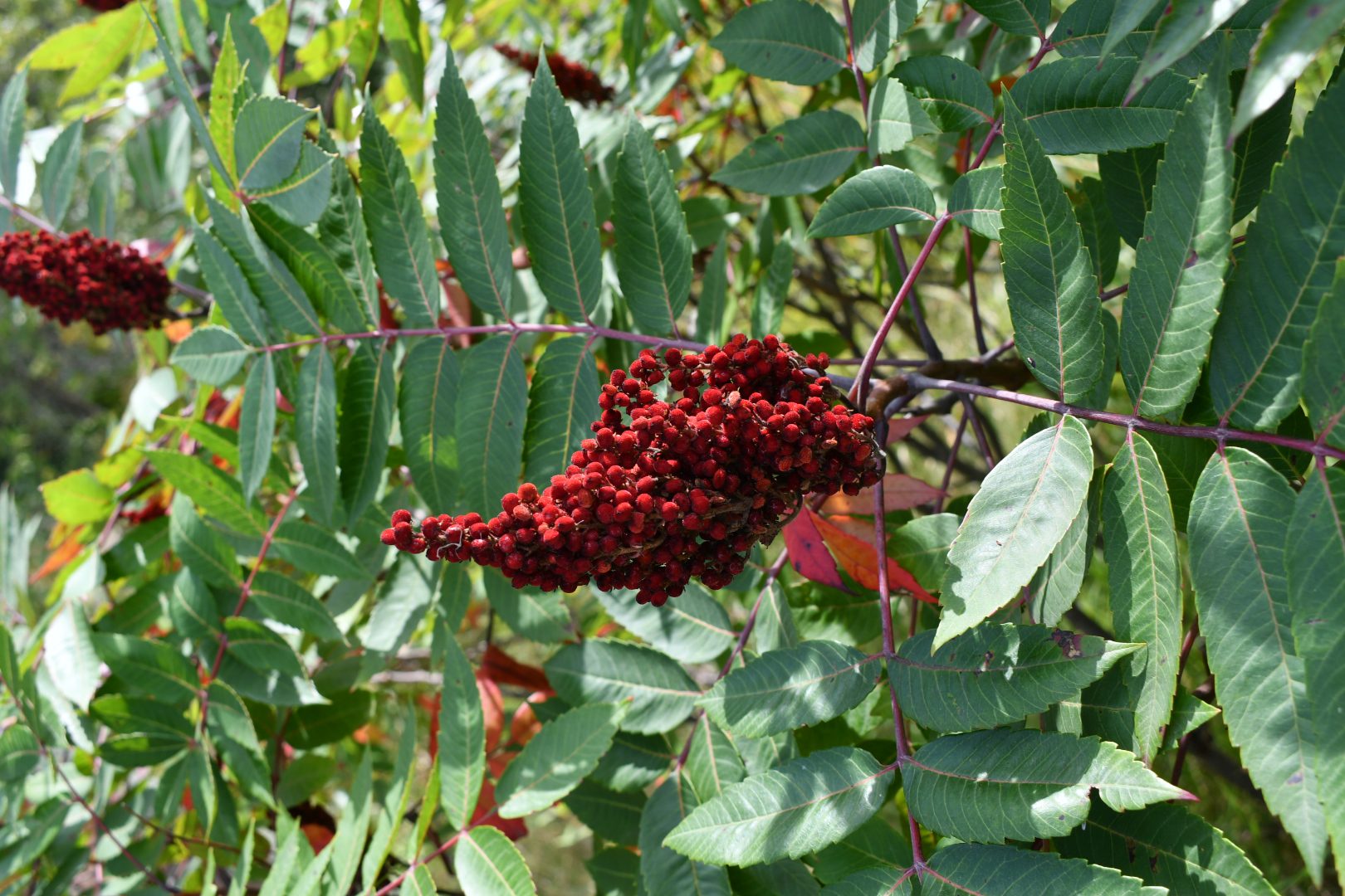 Staghorn sumac has fuzzy branches, while smooth sumac does not (hence the name). Both have odd-pinnate compound leaves with many leaflets and cone-shaped berry clusters that turn a rich red. In fall, the leaves turn bright red, making the plant easy to spot.